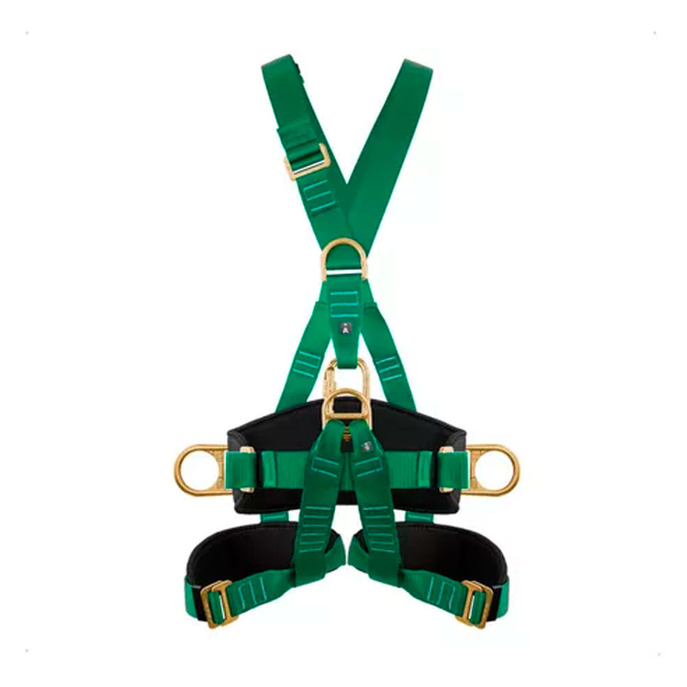 Cinco meia argolas em aço forjado bicromatizado: Uma dorsal e uma peitoral para retenção de queda, uma umbilical para suspensão e duas laterais para posicionamento.