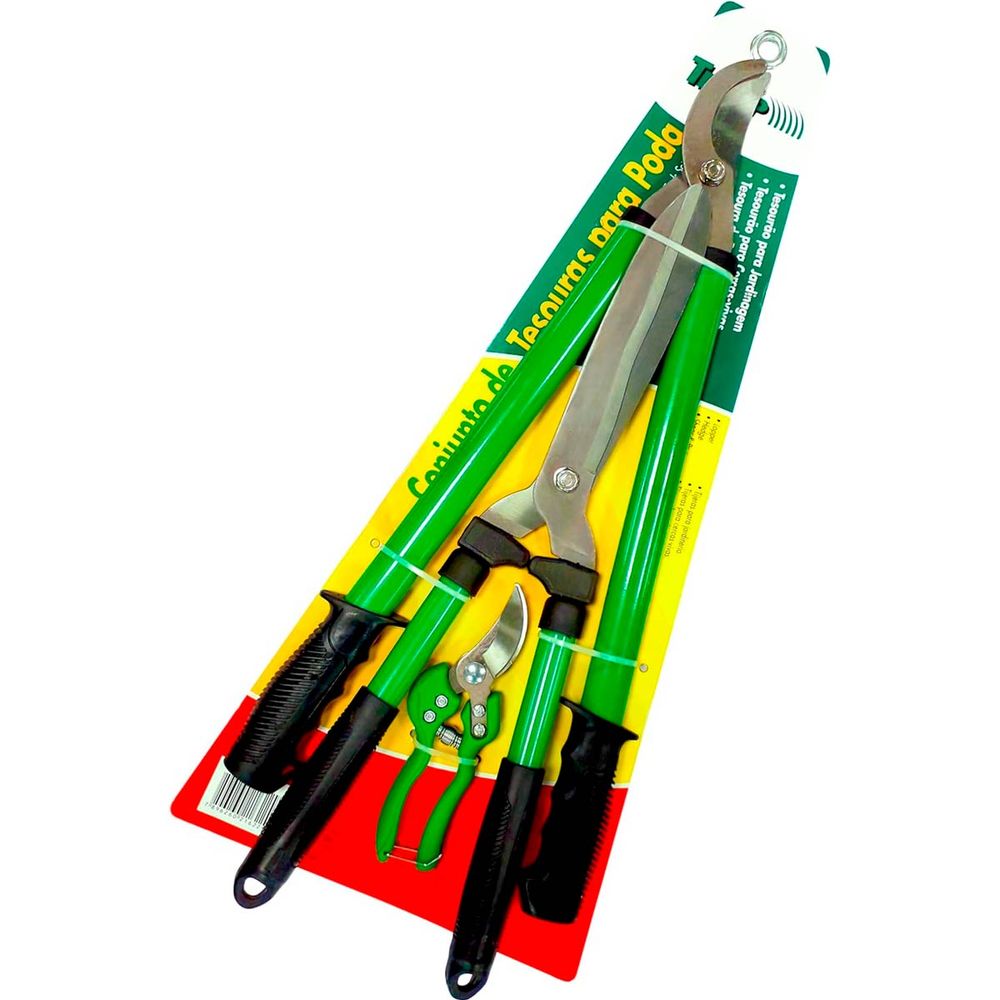 Itens inclusos: 01- tesoura para grama e cercas-vivas; 01- tesoura para poda de galhos; 01- tesoura para jardim.