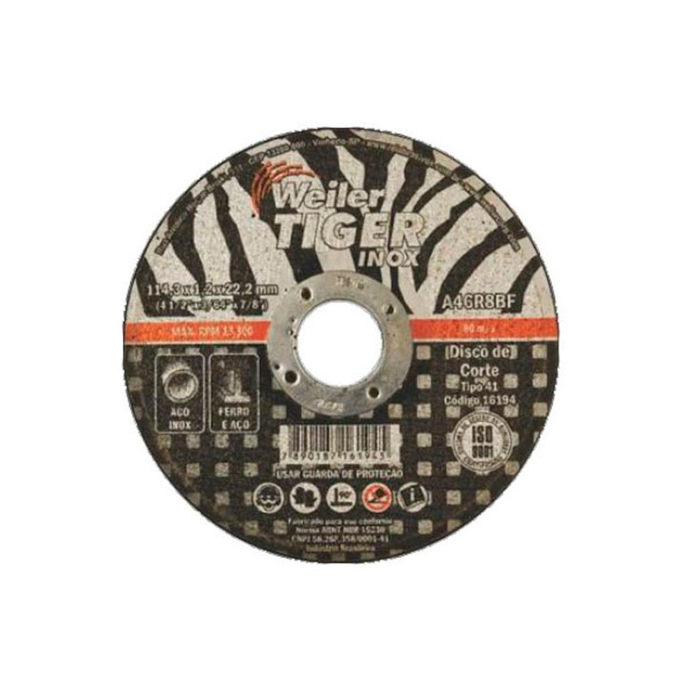O Disco de Corte Weiler para Inox tem uma excelente performance e alto poder de corte. Disco extremamente seguro, proporciona um corte 'firme' sem vibrar e trepidar. Os discos da marca americana Weiler Tiger Inox apresentam uma vida útil (durabilidade) bem acima da média dos discos de classe 'premium' à disposição no mercado.