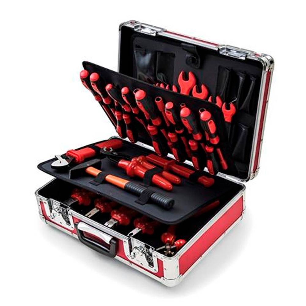 -01 Alicate bico curvo isolado IEC 60900 - 8'' - 01 Alicate bomba-d'água isolado IEC 60900 - 10'' - 01 Alicate corte diagonal isolado IEC 60900 - 6'' - 01 Alicate desencapador isolado IEC 60900 - 7'' - 01 Alicate meia cana isolado IEC 60900 - 6'' - 01 Alicate universal isolado IEC 60900 - 8'' - 01 Chave ajustável isolada IEC 60900 10'' - 01 Chave canhão isolada IEC 60900 - 10 mm - 01 Chave canhão isolada IEC 60900 - 11 mm - 01 Chave canhão isolada IEC 60900 - 12 mm - 01 Chave canhão isolada IEC 60900 - 13 mm - 01 Chave canhão isolada IEC 60900 - 6 mm - 01 Chave canhão isolada IEC 60900 - 7 mm - 01 Chave canhão isolada IEC 60900 - 8 mm - 01 Chave canhão isolada IEC 60900 - 9 mm - 01 Chave de fenda isolada IEC 60900 ponta chata 3x75 mm - 01 Chave de fenda isolada IEC 60900 ponta chata 5x100 mm - 01 Chave de fenda isolada IEC 60900 ponta chata 6x150 mm = 01 Chave de fenda isolada IEC 60900 ponta cruzada Nr. 0 (3x150 mm) - 01 Chave de fenda isolada IEC 60900 ponta cruzada Nr. 1 (5x100 mm) - 01 Chave de fenda isolada IEC 60900 ponta cruzada Nr. 2 (6x150 mm) - 01 Chave fixa isolada IEC 60900 10 mm - 01 Chave fixa isolada IEC 60900 11 mm - 01 Chave fixa isolada IEC 60900 12 mm -01 Chave fixa isolada IEC 60900 13 mm -01 Chave fixa isolada IEC 60900 14 mm -01- Chave fixa isolada IEC 60900 15 mm -01 Chave fixa isolada IEC 60900 16 mm -01 Chave fixa isolada IEC 60900 17 mm -01 Chave fixa isolada IEC 60900 19 mm - 01 Chave fixa isolada IEC 60900 22 mm - 01 Faca reta desencapadora isolada IEC 60900 - 7" - 01 Maleta para ferramentas -01 Martelo de pena 300 g - cabo com alma de aço -01 Miniarco de serra isoado IEC 60900 - 6" *Imagens meramente ilustrativas.