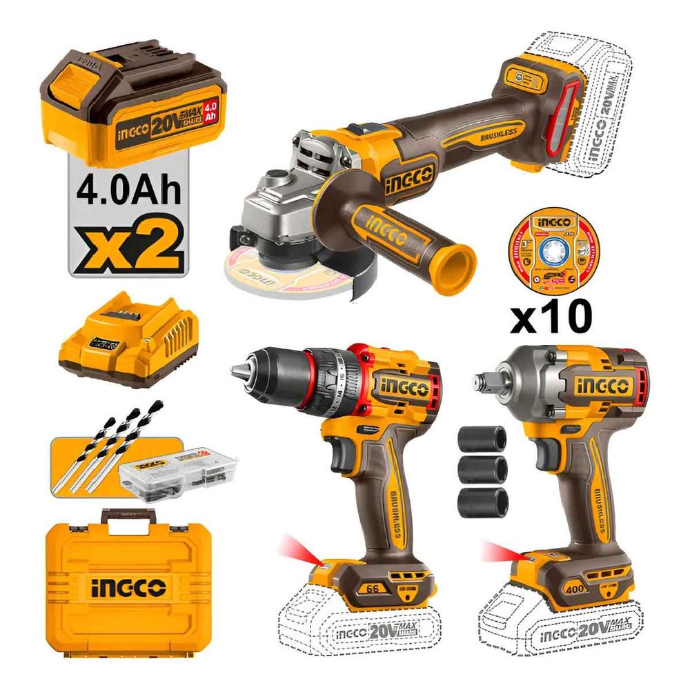 Parafusadeira + Chave de Impacto 1/2" + Esmerilhadeira 4.1/2" Ingco com Acessórios - Combo